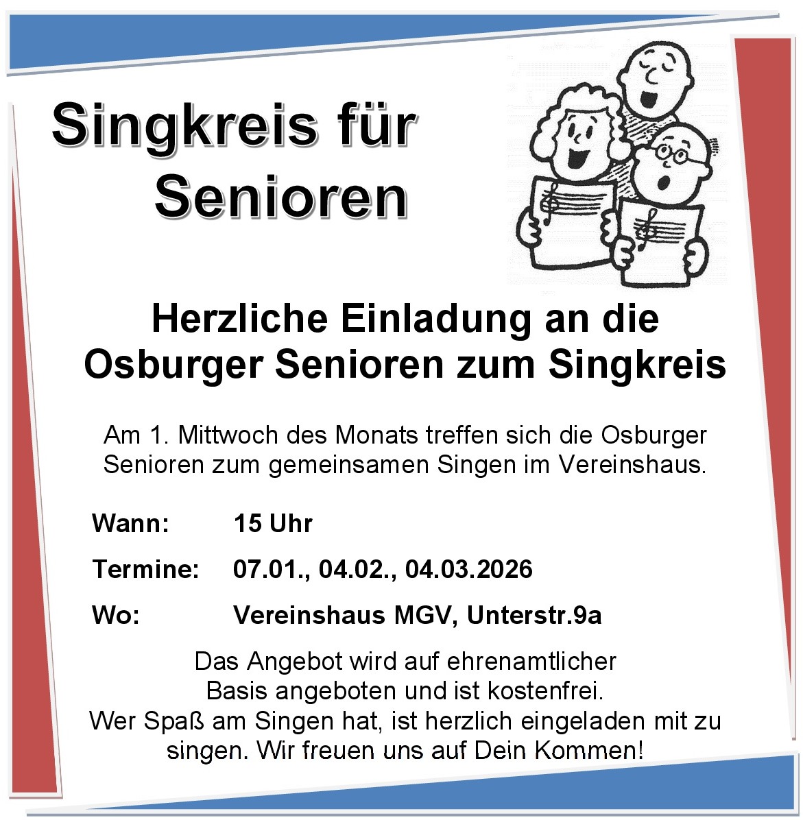 Am 1. Mittwoch des Monats treffen sich um 15 Uhr die Osburger Senioren zum gemeinsamen Singen im Vereinshaus des MGV, Unterstr. 9a.