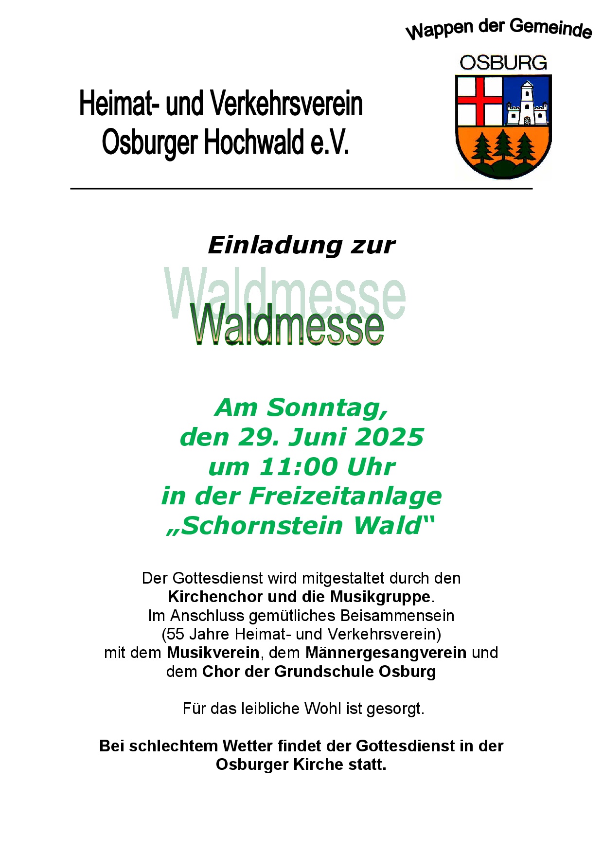 Der Heimat- und Verkehrsverein Osburger Hochwald e.V. lädt am Sonntag, 29. Juni 2025, um 11 Uhr zur jährlichen Waldmesse in der Freizeitanlage „Schornstein Wald“ in Osburg ein.
