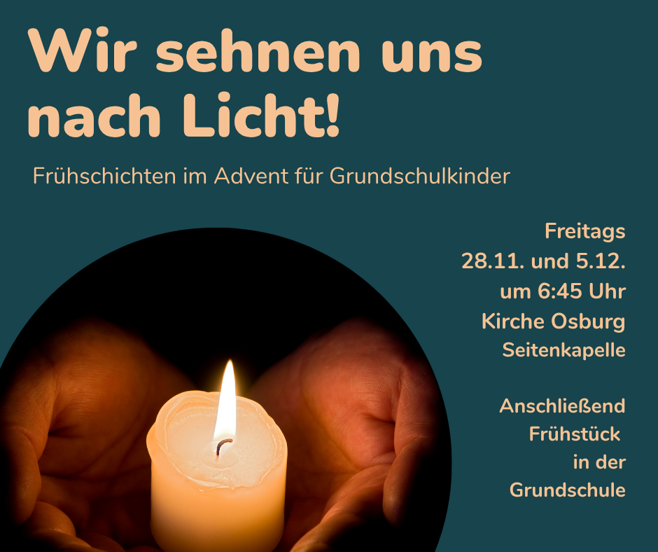 Herzliche Einladung an alle zu den Frühschichten im Advent. Freitag, 28.11.2025 Freitag, 5.12.2025 Jeweils um 6.45 Uhr in der Kirche (Seitenkapelle) in Osburg. Zusammen mit den Grundschulkindern wollen wir den Advent besonders gestalten und gemeinsam in den Frühschichten erleben. Wer